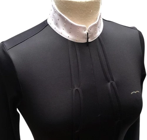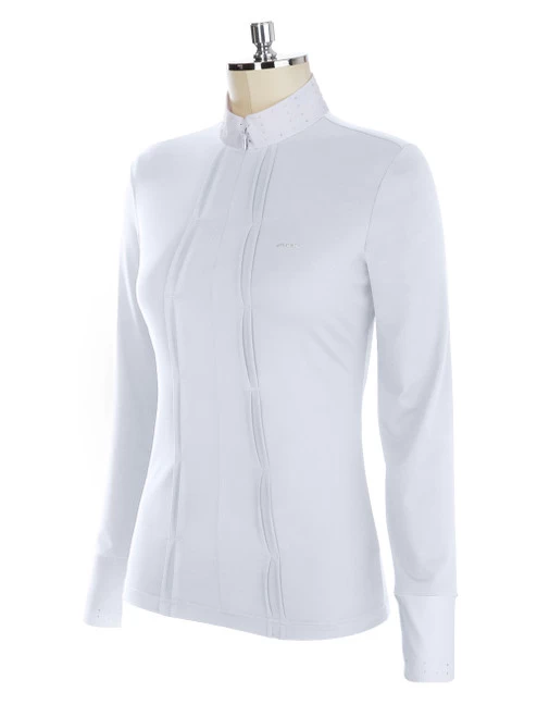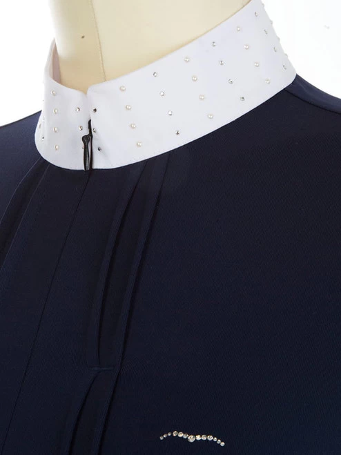 The Animo Bruce Show Shirt just might be the most elegant competition shirt of the year with its tasteful pleats and petite pearl and crystal accents. Sophisticated Bruce Show Shirt has a simple pleat detail in front with hidden quarter zip and small crystal Animo logo at the chest. The white standing collar and white stretch cuffs have rows of small pearls and crystals. The collar has a stock loop to give you more showing options.
