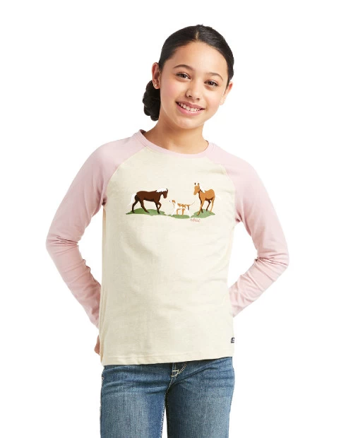 Girls Ariat casual T-shirt has cute feminine touches plus a versatile neutral Oatmeal heather color with pretty Ash Rose raglan sleeves. The Pasture Scene Long Sleeve Tee is a cute top for riding, school, or fun times with friends. Children’s Ariat tee will cross over into any wardrobe style and the dreamy soft fabric is sure to be a hit.