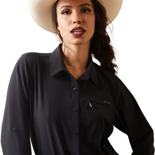 Ariat VentTEK II Stretch Shirt is a sun protection shirt that is perfect for riding, outdoor work, and outdoor sports. Riders, equine veterinarians, farriers, and chiropractors will appreciate the great feel and the convenience of tie up sleeves. Women’s TEK shirt is part of Ariat’s Heat Series for warm weather riding. It keeps you cool and protected from UV sun rays and has practical features for everyday function. The VentTEK II has a sunglasses cleaning cloth on the shirt tail, single chest pocket, and looks good worn loose or tucked in. The body mapping VentTEK construction allows maximum airflow with mesh vents so you stay cool, dry, and comfortable. Ariat VentTEK II Stretch Shirt in solid colors and prints is a great looking and practical women’s shirt for riders and those who work around horses.