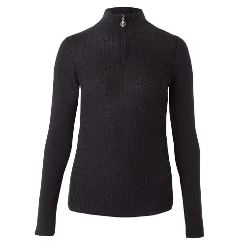 B Vertigo Ruth 1/4 Zip Sweater in cable knit and flat knit is lightweight, breathable, and comfortable for riding. The yarn blend is merino wool and acrylic so you get the performance features plus easy care. Classic neutrals Shiitake, Old Rose Pink, and Dark Blue will look good always!