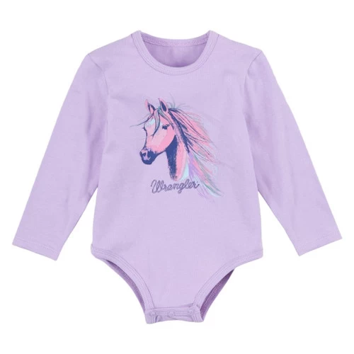 Wrangler Pretty Horse Onesie is the perfect wardrobe addition for your little cowgirl. The long sleeve onesie is a soft purple color with colorful sweet horse graphic on the front. The delicate horse head with turquoise and purple accents has a windswept mane and forelock. The rope Wrangler name is underneath it, representing authentic cowgirl style.