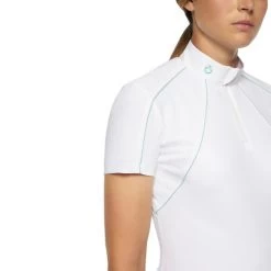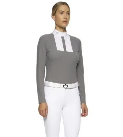 Girls Team Daytona Long Sleeve Competition Polo has a slim, stretchy fit with technical jersey that wicks, dries, quickly, and prevents odors. The high collar is a cotton blend poplin and features an embroidered CT logo. The pullover polo has a quarter zipper with CT pull. White contrast piping and Team racing graphic is sophisticated and distinctive. Girls Cavalleria Toscana Team Daytona Long Sleeve Polo is a great look for horse show competitors who love superior performance and style.