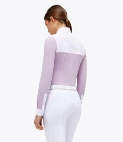 Women’s 3-button CT jacket is a structured soft shell that’s lined at the shoulders and sleeves. A special lining along the front helps the Knit Collar Riding Jacket maintain a flat appearance. There’s a double back vent, feminine shaping, and fully finished interior seams. Lovely black shiny CT buttons at the front plus smaller matching ones at the cuffs add to the custom look. A raised padded stitched CT logo on the right sleeve is the finishing touch. The moisture wicking quick drying technical fabric offers breathable comfort, antibacterial freshness, and UV protection. Enjoy the professional look and feel of the Cavalleria Toscana Knit Collar Riding Jacket in the ring, then turn up the collar to show off the striped knit lining. Very chic!