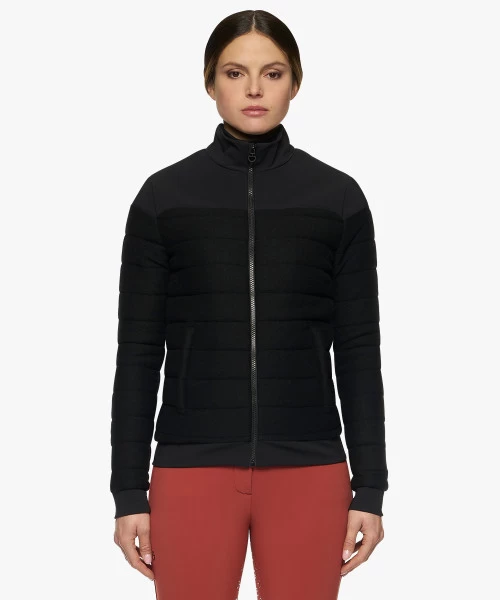Cavalleria Toscana Wool and Jersey Quilted Jacket is a beautiful casual jacket with classic stretch wool quilted padding plus performance jersey for a sleek it. Elegant and sporty Wool Quilted and Jersey Jacket from Cavalleria Toscana is ideal for chilly mornings or evenings that get dark far too soon. Women’s equestrian casual jacket has a jersey yoke, tall collar, cuffs, and hem. The unique wool quilting and heat-sealed seam tape means excellent core warmth.