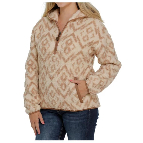 Women’s Cinch Print Sherpa 1/2 Zip Hoodie in lovely cream color soft fleece has a sophisticated Southwest pattern for an upscale cozy look. The Cinch Sherpa Hoodie features a geo pattern in taupe/tan and is finished with matching trim. It’s a pullover with half zip neck for easy wear. This fluffy jacket is surprisingly lightweight for comfortable layering on cold days.
