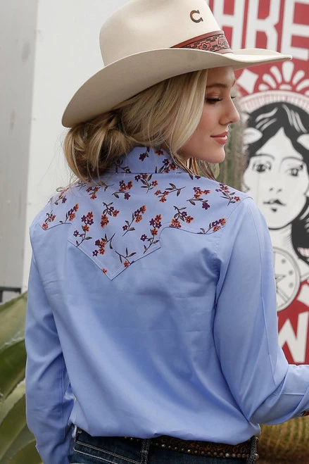Cruel Denim Floral Printed Yoke Shirt is a true beauty in dreamy lilac color with floral trim and classic Western style. Women’s long sleeve snap shirt has fancy Western yokes and patch pockets with angled flaps.