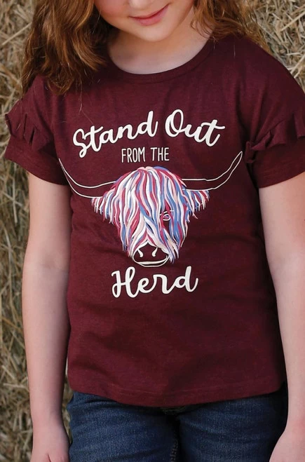 Cruel Girls Stand Out From The Herd casual T-shirt has a rounded neckline and hem. The short sleeves are trimmed with a ruffle for an extra girly touch. The dark heather burgundy color is pretty plus it hides the dirt if your girl happens to snuggle with a horse or cow. Girls Western summer tee is so fun, and definitely stands out from the herd!