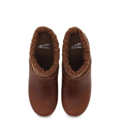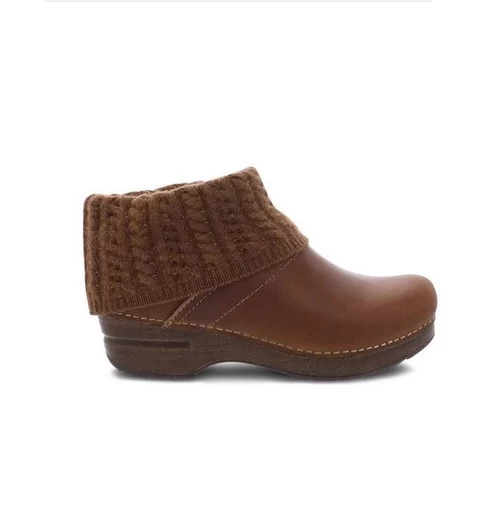 The Dankso Chloe Pull Up in Oiled Tan is the classic stapled clog you love with an attached cable knit sock cuff for extra cozy warmth and ankle boot style. The oiled leather is durable and water resistant. The Chloe features a padded instep collar, roomy reinforced toe box, and PU outsole with rocker bottom that absorbs shock and helps propel each step.