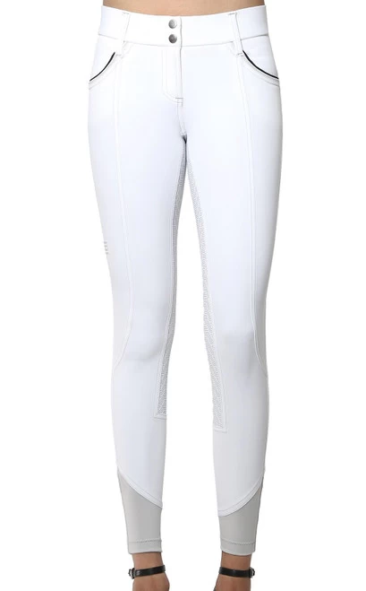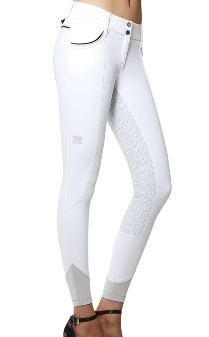 GhoDho Adena Grip Full Seat Breeches offer style, flattering fit, and a technical fabric that is lightweight and moisture wicking. Women’s full seat breeches have a low/medium rise with front zip. The silicone grip full seat Adena Breech from GhoDho has double piping for an upscale look and feminine shaping for your best look in and out of the saddle. The full seat is a geometric pattern silicone that delivers grip with flexibility.