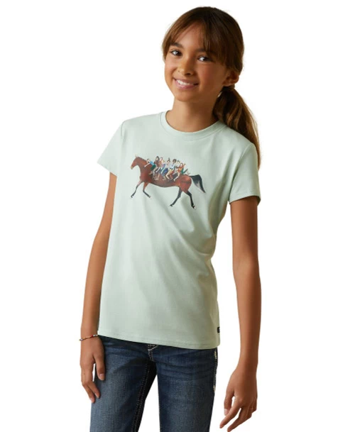 Fun and casual Girls Ariat Harmony Tee has a whimsical print on the front and pretty Aqua Foam color. The Ariat exclusive graphic shows a very long-backed horse with an entire barnful of girls along for the ride. The Harmony T-shirt is stretch organic cotton jersey that’s lightweight, smooth, and breathable.
