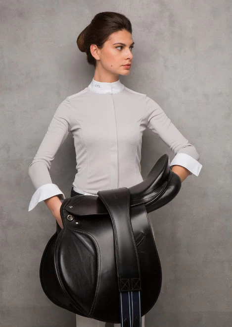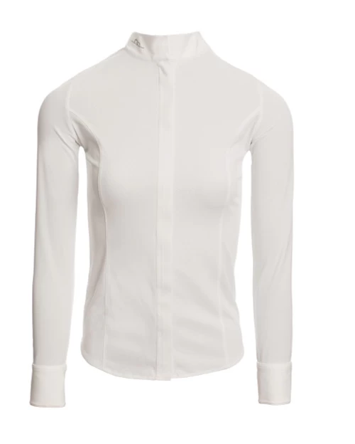 Horseware AA Clean Cool Competition Shirtย is a stylish riding shirt for women with long sleeves and covered full length zipper in front. The Clean Cool show shirt features an elegant Alessandro Albanese design and is part of Horseware Ireland’s luxurious AA Platinum collection. This performance riding top is made with Clean Cool Polyester fabric that is breathable and lightweight. It wicks perspiration away from the skin so it can dry rapidly and has antibacterial properties that discourage the formation of odors, keeping you and your shirt fresher.