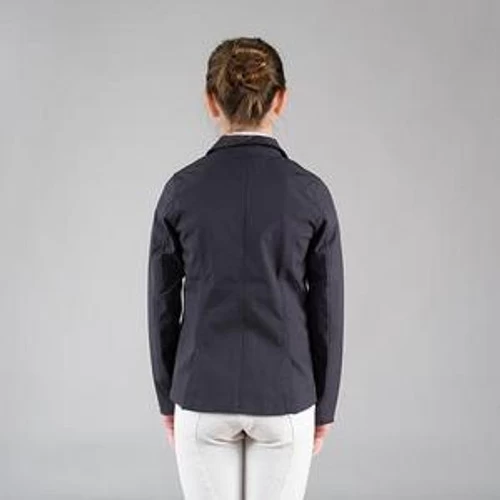Horze Adele Junior Show Coat is just the one for the young rider who wants a modern softshell show jacket but needs to stick with a budget. Affordable horse show jacket for girls is a lightweight softshell in versatile black or dark blue. The Adele looks modern and chic yet still has the 3-button style to work in multiple arenas. Horze Equestrian’s Adele Junior Show Coat is softshell material that’s backed in a sateen fabric so it slides on easily and will show a flash of silver at the vents when jumping. The interior has fully finished seams with binding. The sleeves have an articulated seam that “follows” the arm, allowing a smoother line. Nice details! The material is stretchy, breathable, moisture wicking, and quick drying to get your young rider into her class looking and feeling her best.