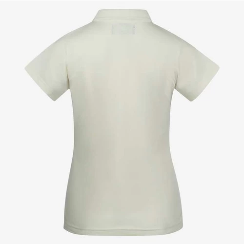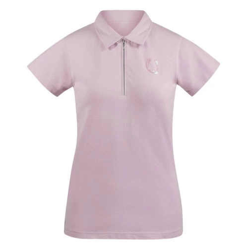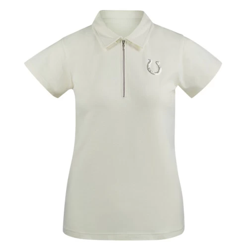 The Amy Polo from Horze Equestrian has a simple, understated look with minimal embellishments or branding. There are no pockets and the zipper lies nice and flat. Besides the sequin horseshoe, there is a small metal “Z” tag at the hip. That’s it! No other trim and no embroidery. The lovely Egret color is a soft candlelight cream while the Purple color is a light rosy hue. Great style and a great price! The Horze Amy Polo Short Sleeve Shirt is cute and versatile for riding and casual sportswear.