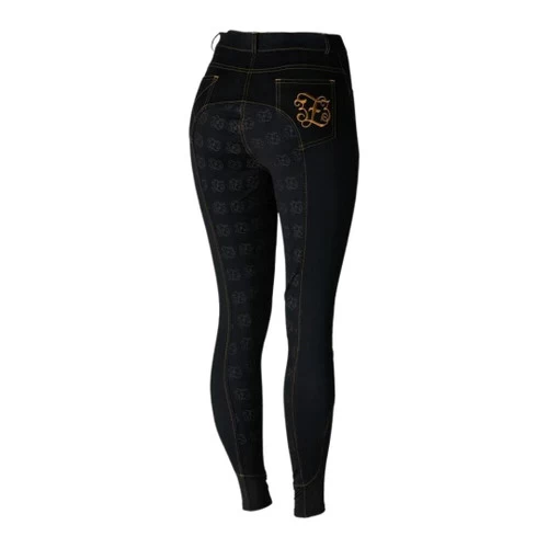 Horze Jessie Denim Full Grip Breeches with silicone print seat are denim-styled riding breeches with soft stretch fabric. Women’s high waist full seat horseback riding breeches offer a lightweight, comfortable fit and elegant details. The Jessie full grip seat is printed in a fancy Horze emblem that matches the gold embroidery on the back pocket.