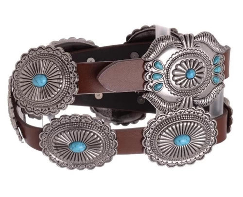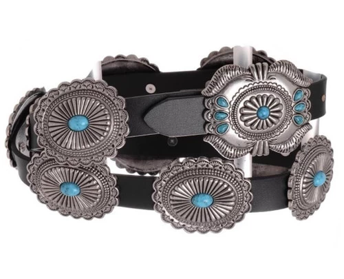 Distinctive Turquoise on Concho Leather Belt is a wonderful statement piece for women’s Western and ranch wear wardrobes. This is the perfect belt to pair with a Western skirt or Wrangler denim dress. The finely detailed conchos are securely attached to the leather with Chicago screws. The Concho Leather Belt has three holes with each hole corresponding to a waist size. Los Angeles-based Kamberley Group manufactures custom belts for many retailers as well as their own unique beautiful designs for adults and kids.