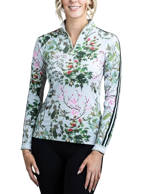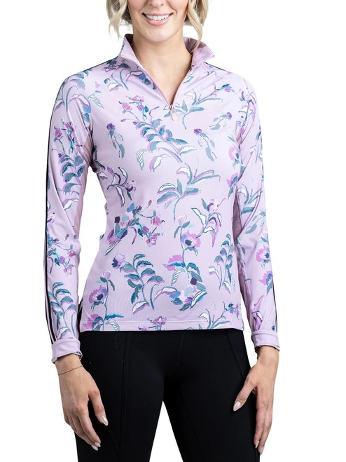 Women’s Kastel Denmark Raglan Long Sleeve Shirt with Trim in new Secret Garden and Lilac Fleurs botanical prints features a sporty stripe down the sleeves for extra style. Kastel Denmark quarter zip riding top is a lightweight, silky shirt with UPF30+ sun protection. The fabric wicks moisture, dries fast, and keeps you cool and comfortable.