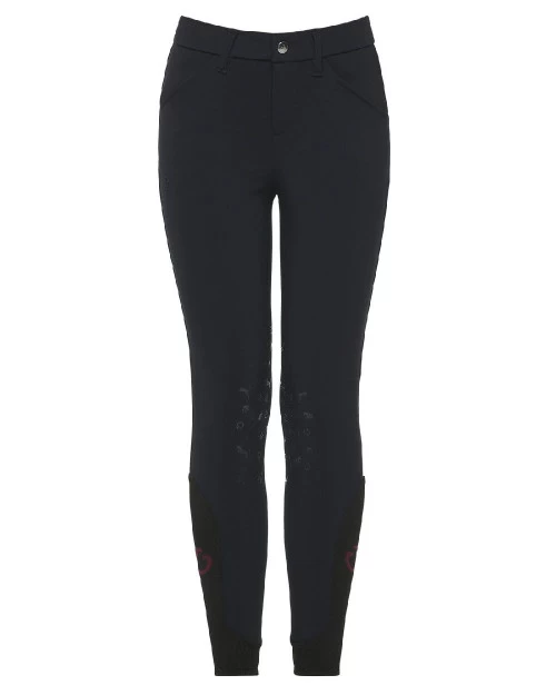 Boys and Girls hunter jumper breeches from Cavalleria Toscana offer a four-way stretch technical jersey fabric that is breathable and super comfortable. The exclusive Horse and Helmet silicone print knees provide flexible grip in the saddle. Front zip Euro seat breeches have front pockets and wide belt loops. Stretch knit panels at the lower leg accommodate different calf sizes and allow a sleek fit under tall boots and half chaps. Horse & Helmet Kids Breeches from Cavalleria Toscana are quality children’s equestrian clothes that work well for jumping, eventing, clinics, and lessons.