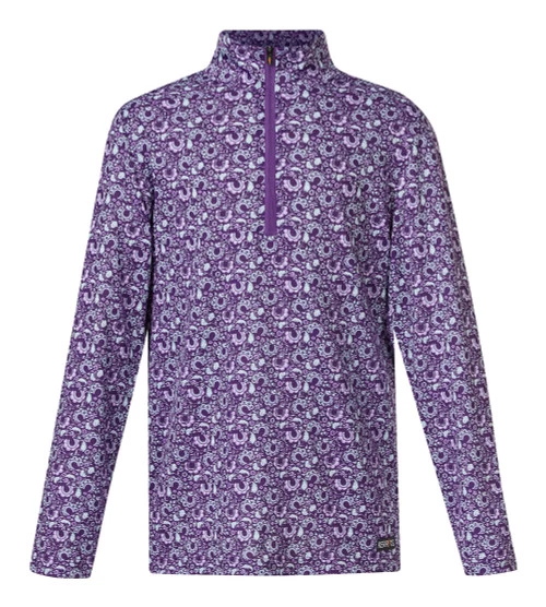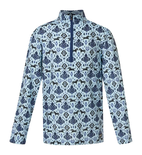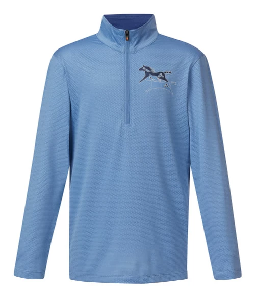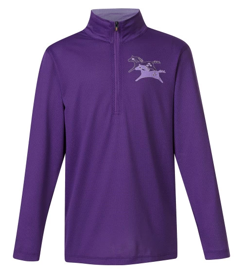 The Girls Always Cool Ice Fil Long Sleeve Shirt from Kerrits has a 10-inch zipper and convenient stock tie on the tall collar. Super breathable and lightweight summer riding shirt is wicking, quick drying, and stretchy. Kids who ride and spend lots of time at the barn love the flattering, comfortable fit and coverage of Kerrits Ice Fil Shirts. They are easy to tuck into breeches and jeans and look great worn loose over Kerrits riding tights. Mary’s has the Kids Kerrits Always Cool Ice Fil Long Sleeve Shirt in two solid colors, Lake and Iris, with small horse graphic at the front. The prints are Ink Painted Horse and Iris Make Your Luck.