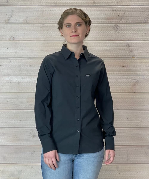 The Linville Coolmax Shirt has a button front, spread collar, and a straight back yoke. The single open pocket at the chest features a sporty Kimes Ranch horns logo rubber tag. The fabric has a slight pattern to it, giving it nice depth and softening of the color. The Coolmax blend fabric is moisture wicking, quick drying, and easy care. Ladies casual Western shirt offers a nice crisp look while keeping you comfortable. Mary’s has the Kimes Ranch Linville Coolmax Shirt for women in Blue and Black.