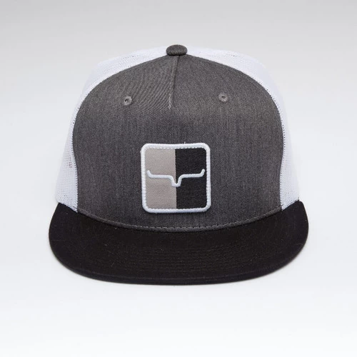 Kimes Ranch Mirror Trucker Hat is a high profile Tall Boy cap with flat bill and cool mesh back. It features a patch with the Kimes horns logo with a light grey/dark grey divided background. The Western casual baseball cap will shade your face and protect your head from the sun in style.