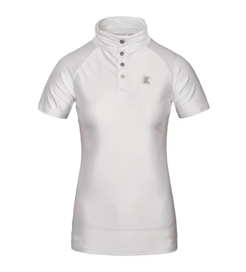 Women’s Bonnie Show Shirt from Kingsland delivers wicking, quick drying performance plus plenty of stretch for total comfort while competing. The lines are flattering and feminine and the all-white color with shimmering silver is eye-catching in the show ring. The Kingsland K embroidery logo at the chest is heavily accented with crystals. Below the collar in back you’ll find a silver Kingsland logo with a scattering of crystals. Enjoy the beauty and comfort of the Kingsland KL Bonnie Show Shirt this summer show season!