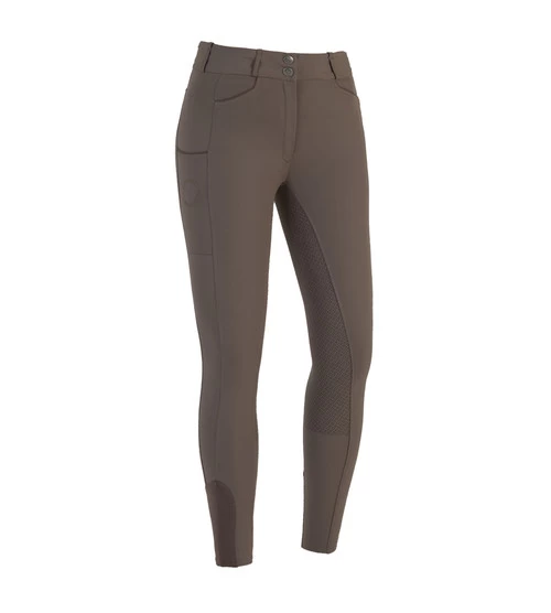 Kingsland Klara Full Grip Breech keeps its stretch with a flexible silicone print grip seat. Casual dressage riding breeches from Kingsland have a high, wide waistband, faux pockets in front and back, and a handy phone pocket on the thigh with 3D rubber print logo. Casual dressage riding breeches are ideal for schooling and training and the rich brown color is so easy to wear. With premium new fabric, the ladies Kingsland Klara T-Tec Breeches are a smart addition to your dressage riding wardrobe