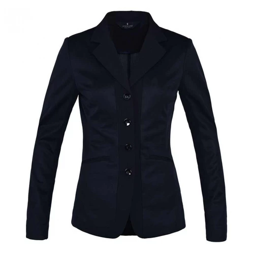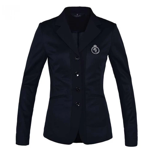 Kingsland Pierlas Mesh Show Jacket for women has breathable stretch mesh construction and classic tailoring for show ring style with comfort. The Pierlas from Kingsland comes in 2 versions; the black jacket has a distinctive KL embroidered badge at the chest while the navy jacket has no emblem. Ladies 4-button competition jacket has a tapered profile, faux slash pockets, decorative buttons on cuffs, and double vent in back. The Pierlas is unlined for optimal ventilation.