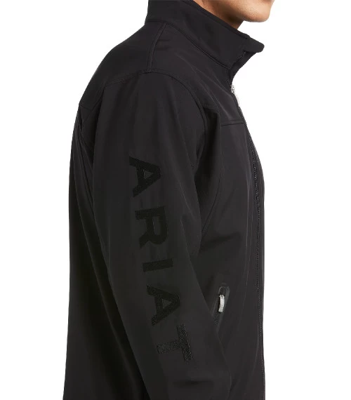 Men’s Ariat New Team Softshell Jacket in black with black logo offers warmth, lightweight stretch comfort, and sporty style. The New Team Softshell for men is part of the Ariat TEK Cold Series with smart features that riders will appreciate.
