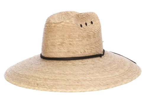 Dorfman Overcast Lifeguard Hat offers ample coverage all around. The chin cord with plastic adjuster helps keep it in place and the pinched crown with metal eyelets allows air circulation for a cooler head. The soft elasticized sweatband is comfortable and ensures a good fit. The palm leaf Dorfman Overcast Lifeguard Hat for men is naturally water resistant as well as UV protective. The Natural color sun hat is finished with a brown braided rope hat band and chin cord.