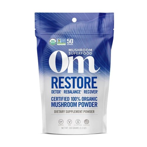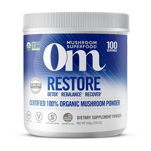 Om Organic Mushroom Nutrition focuses on raw food, vegan, kosher, and non-GMO supplements for people. Once the mushrooms are grown and harvested they are milled into a silky, fine, mild-tasting powder that blends into a smoothie, shake, or juice. The 2 gram serving is one level teaspoon. Om Restore provides targeted nutritional support when your health needs it most.