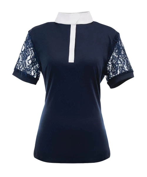 Women’s Elegance Lace Short Sleeve Show Shirt balances the feminine and sporty with performance fabrics and soft lace sleeves. Ladies short sleeve horse show shirt has a white covered placket and wrap collar that snaps closed. The back of the collar has a stock tie loop to give you more showing options.