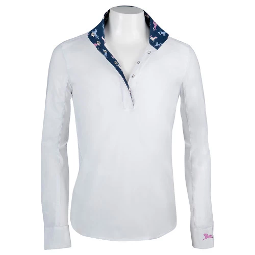 The Rebecca’s snap quarter placket style means easy pull-on and quick dressing for busy kids. The wrap collar closes with snaps and the covered placket assures a neat look under a hunt coat. Collar and cuffs of the Rebecca Junior Show Shirt are lined with an adorable new Popsicles pattern or older Unicorns or Cats pattern. Girls show shirt from RJ Classics features white mesh underarm panels and a mesh panel at the back shoulder area for extra ventilation. RJ Classics Rebecca Jr. Show Shirt adds signature style and a high level of performance to the competitive rider’s wardrobe.