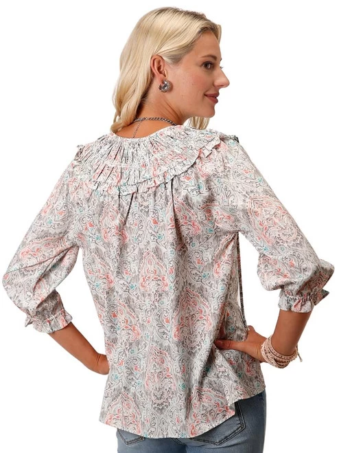 Roper Shirred Ruffle Collar Top has a romantic vibe with its dramatic collar and loose, flowy fit. The beautiful floral paisley print in brown, aqua, and coral colors is subtle and soft, making it easy to pair with wardrobe favorites. The Shirred Ruffle Collar Top for women has half length sleeves with an elasticated ruffle cuff that enhances the poet blouse look.