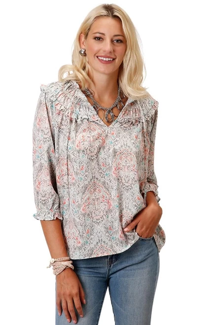 Shirred Ruffle Collar Top from Roper frames the face with a wide rounded overlay collar that closes with tie strings or can be worn untied. The longer back hem enhances the flattering, easy fit. Women’s Western/boho blouse is so versatile for daytime or evening and can be dressed up or down with accessories.