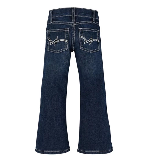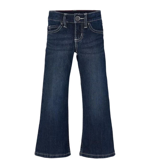 Wrangler Girls Premium Patch Bootcut Jeans are a dark indigo wash with a small amount of whiskering at the front. The back pockets have stylish Wrangler W embroidery in a soft pale tan color. The front has a zipper and snap closure and the snap is disguised to look like a button for a traditional touch. Attractive antique silver pocket tacks and snap cover add the finishing details to these girls jeans. Wrangler Girls Premium Patch Bootcut Jeans are ideal for the kid with the school-to-barn lifestyle.